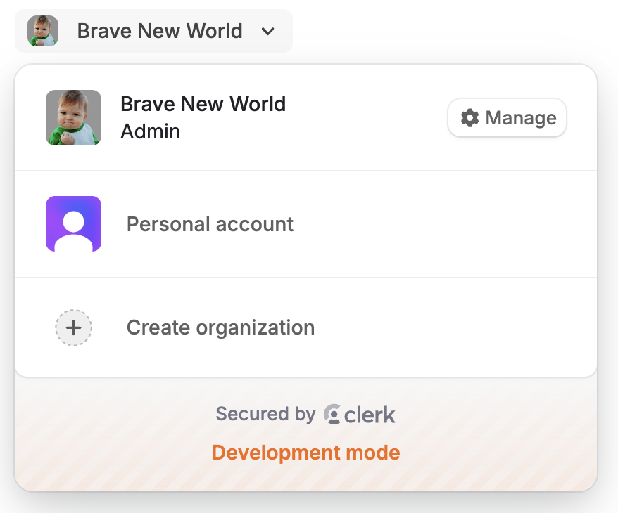 With this one-liner, you'll have a set of fully working UI components for managing organizations and choosing an active one!